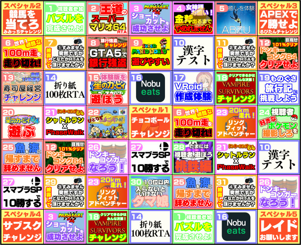 - 様々な理由で長時間待つ必要がある場合、次のルーレットをすることが出来る。ただし、マスをクリアしたら必ず元のマスを達成すること。(待つ必要があるマスによって柔軟に対応予定)